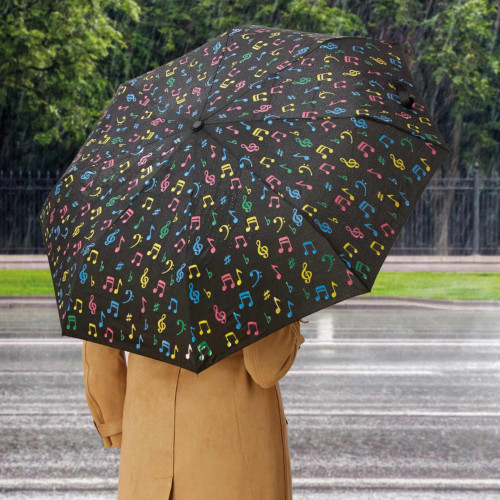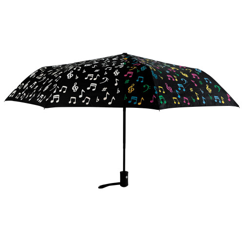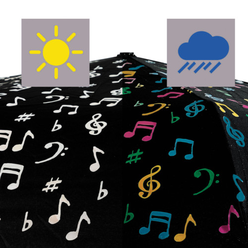 I’m singing in the rain... Avec ce parapluie, chaque averse vous donnera l’envie de fredonner gaiement ce refrain : dès les premières gouttes, les notes de musiques blanches de sa toile se parent de bleu, rouge, jaune, vert ! Une fois sec, les notes redeviennent blanches et il prêt à affronter magiquement la prochaine ondée. Pliant, il dispose d’un système d’ouverture et fermeture automatiques.