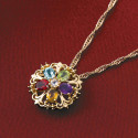 Pierres fines véritables traitées ; diamètre pendentif : 19 mm ; chaîne plaquée or de 45 cm + 5 cm de chaînette de réglage.