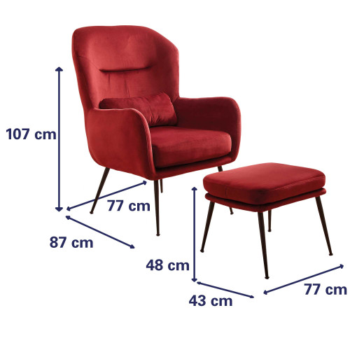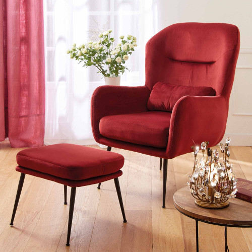 Son élégant velours bordeaux, son dossier haut, ses accoudoirs et assise rembourrés, sa jolie ligne arrondie... Vous n’aurez qu’une envie : vous y blottir et étendre vos jambes sur son repose-pieds assorti. La détente est totale ! Petit +, il est livré avec un coussin.