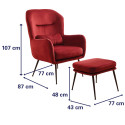 Dim. fauteuil : 107 x 87 x 77 cm, repose-pieds : 48 x 43 x 38,5 cm.
