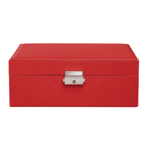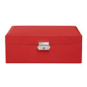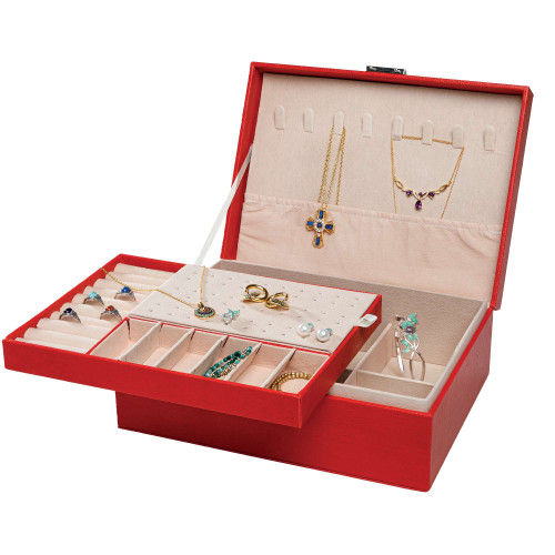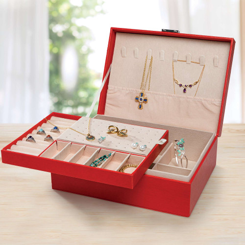 Bagues, colliers, bracelets, boucles d’oreilles… chacun trouve sa place, protégé de la poussière et des frottements, dans cet élégant coffret rouge rubis. Il propose 2 niveaux de rangement : au dessus, un plateau amovible avec rouleaux à bagues et 15 petits compartiments dont 1 rabat perforé ; au dessous, 6 grands casiers dédiés aux montres et bijoux volumineux. Le couvercle offre une large pochette et 8 attaches pour suspendre vos colliers.