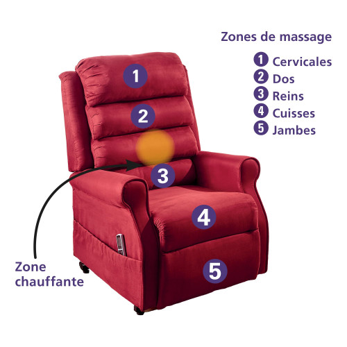 En Micro-Skin® agréablement douce et moelleuse, ce fauteuil bien enveloppant est équipé de 8 moteurs. Il masse ainsi selon votre choix, cervicales, dos, reins, cuisses ou jambes (6 programmes). Pour une détente sur-mesure, vous pouvez moduler l’intensité (3 niveaux) et le temps du massage, ou ajouter de la chaleur au niveau du dos grâce à sa télécommande. Enfin pour une utilisation optimale, il propose une position allongée et vous aide à vous relever.