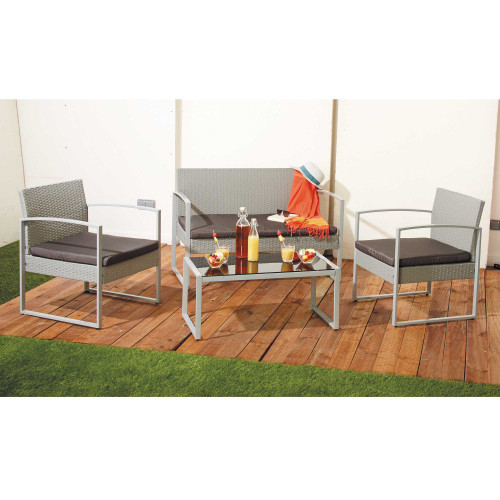Profitez confortablement d’un apéritif au soleil dans ce très élégant salon de jardin. Composé de deux fauteuils et d’un canapé 2 places avec coussins moelleux, il est complété par une table basse avec plateau en verre. Côté design, il conjugue la modernité du camaïeu de gris avec l’intemporalité de la résine tressée façon rotin, conçue pour résister à un usage extérieur.