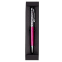 Imaginé comme un véritable bijou, c’est un 2 en 1 vraiment malin. Un élégant stylo roller (qui glisse sur le papier), surmonté d’une partie transparente dans laquelle ont été insérés des cristaux autrichiens scintillants, et un stylet pour les écrans tactiles (fini les traces de doigts !). Présenté dans son écrin, il fera un cadeau original et raffiné.