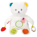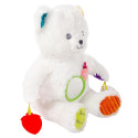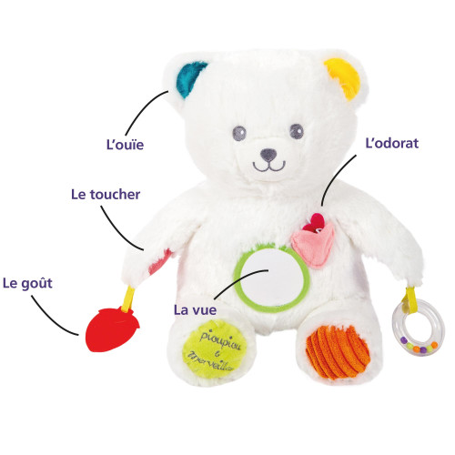 Mieux qu’une simple peluche, cet adorable nounours développe les 5 sens des tout-petits : l’ouïe (pouët et papier bruissant dans les oreilles), la vue (miroir plastique sur le ventre, billes dans le hochet), l’odorat (cœur à parfumer sur la poitrine), le goût (suggéré par une fraise à mordiller) et le toucher (au contact des matières douces, souples ou rigides). À offrir dès la naissance ou pour un 1er Noël.