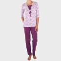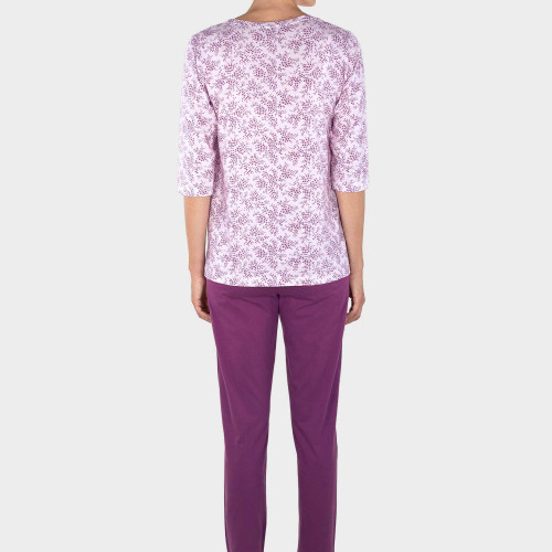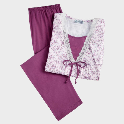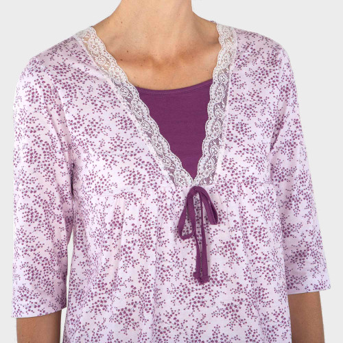 C’est dans la plus confortable des matières, un pur coton peigné, que ce pyjama a été confectionné. Côté séduction, il allie la délicatesse de l’imprimé au raffinement du décolleté habillé d’un plastron souligné de dentelles.