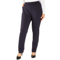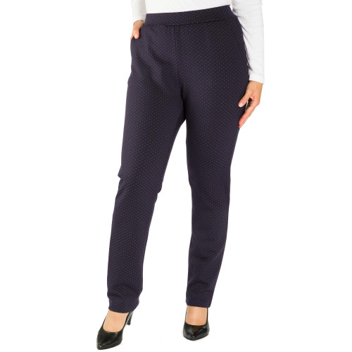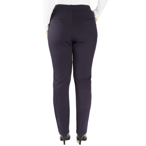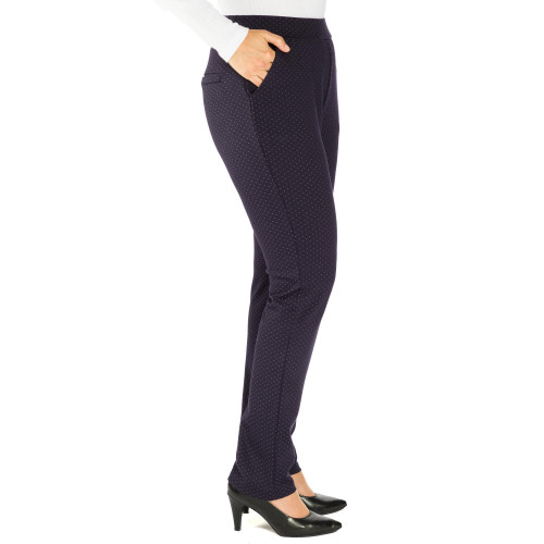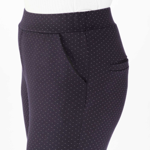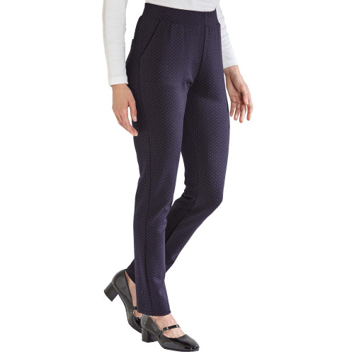 En maille jacquard dense et d’un tombé net, d’une grande extensibilité, il possède surtout une taille élastiquée à ceinture bassin plat dont l’effet gainant efface les petites rondeurs. L’atout élégance ? Son chic coloris marine aux micro-motifs « pointillé », amincissant lui aussi !