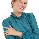 Une maille veloutée dessinant de fines nervures aux reflets soyeux, des fils argentés pour un effet précieux, un coloris turquoise très lumineux… Ce haut fluide est une merveille de raffinement. Sans oublier ses détails de charme : petites fronces aux épaules et finitions volantées (col et poignets élastiqués).