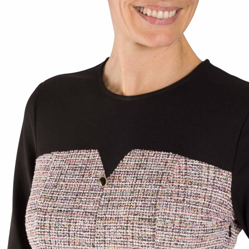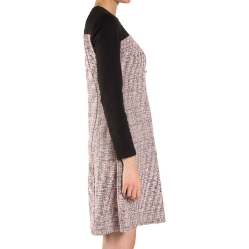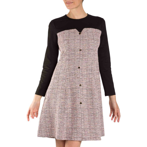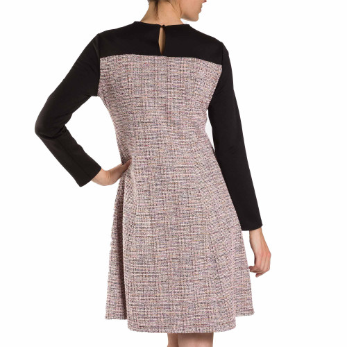 Par sa ligne évasée et son effet bustier (contraste noir/rose), cette robe dessine une silhouette des plus flatteuses. Vous serez également séduite par le confort et l’élégance de sa maille façon tweed, chaleureuse, extensible et discrètement rehaussée de micro-fils argentés.