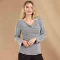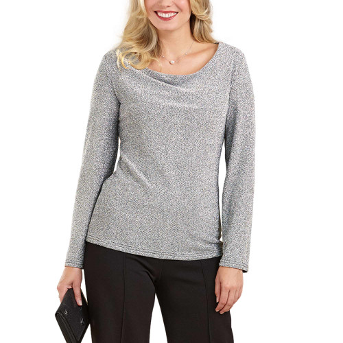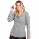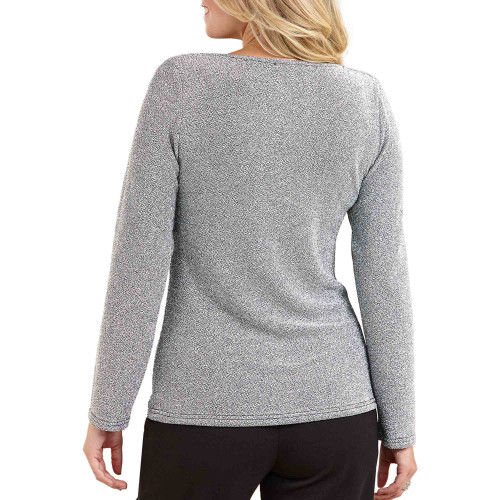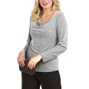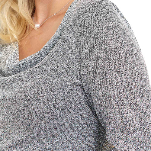 Le haut en maille argentée séduit par son col bénitier qui souligne le décolleté sans être trop échancré. Le