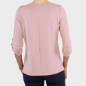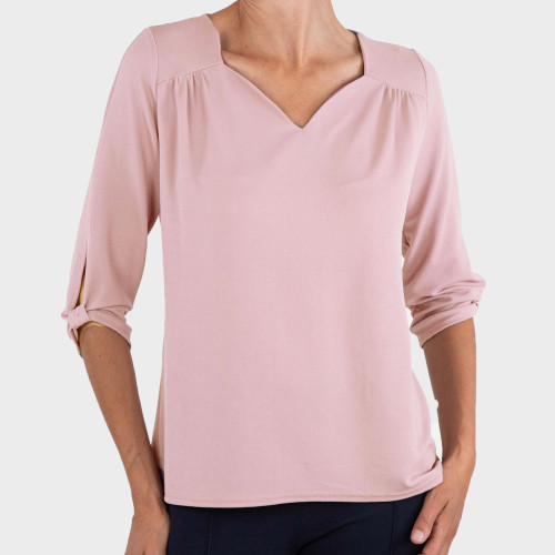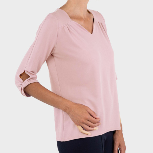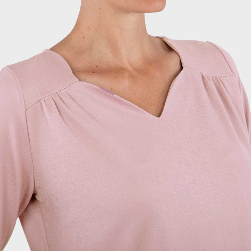 En maille crêpe extensible fluide et toute douce, déclinée en 2 versions (uni et imprimé aquarelle), elle affiche des détails de confection raffinés : empiècements épaules libérant de petites fronces et manches ¾ avec noeud décoratif.